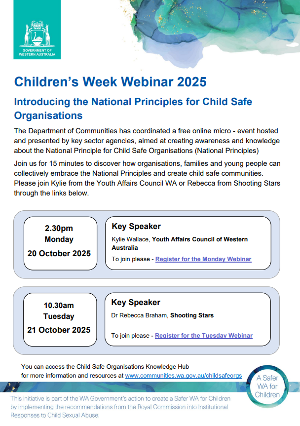 Join us for 15 minutes to discover how organisations, families and young people can collectively embrace the National Principles and create child safe communities. Please join Kylie from the Youth Affairs Council WA or Rebecca from Shooting Stars through the links below.