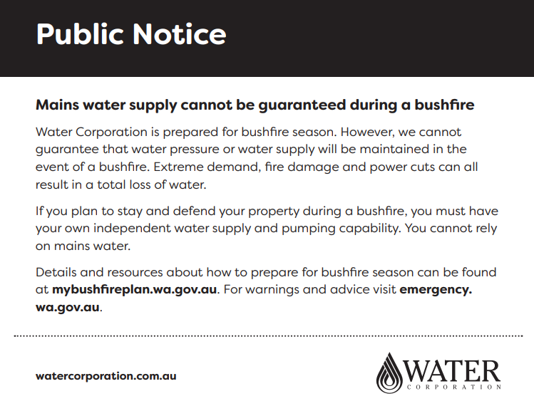 This is required as mains water supply and pressure cannot be guaranteed during a bushfire due to the risk of power cuts, fire damage and extreme demand.
